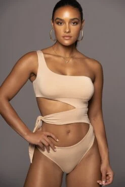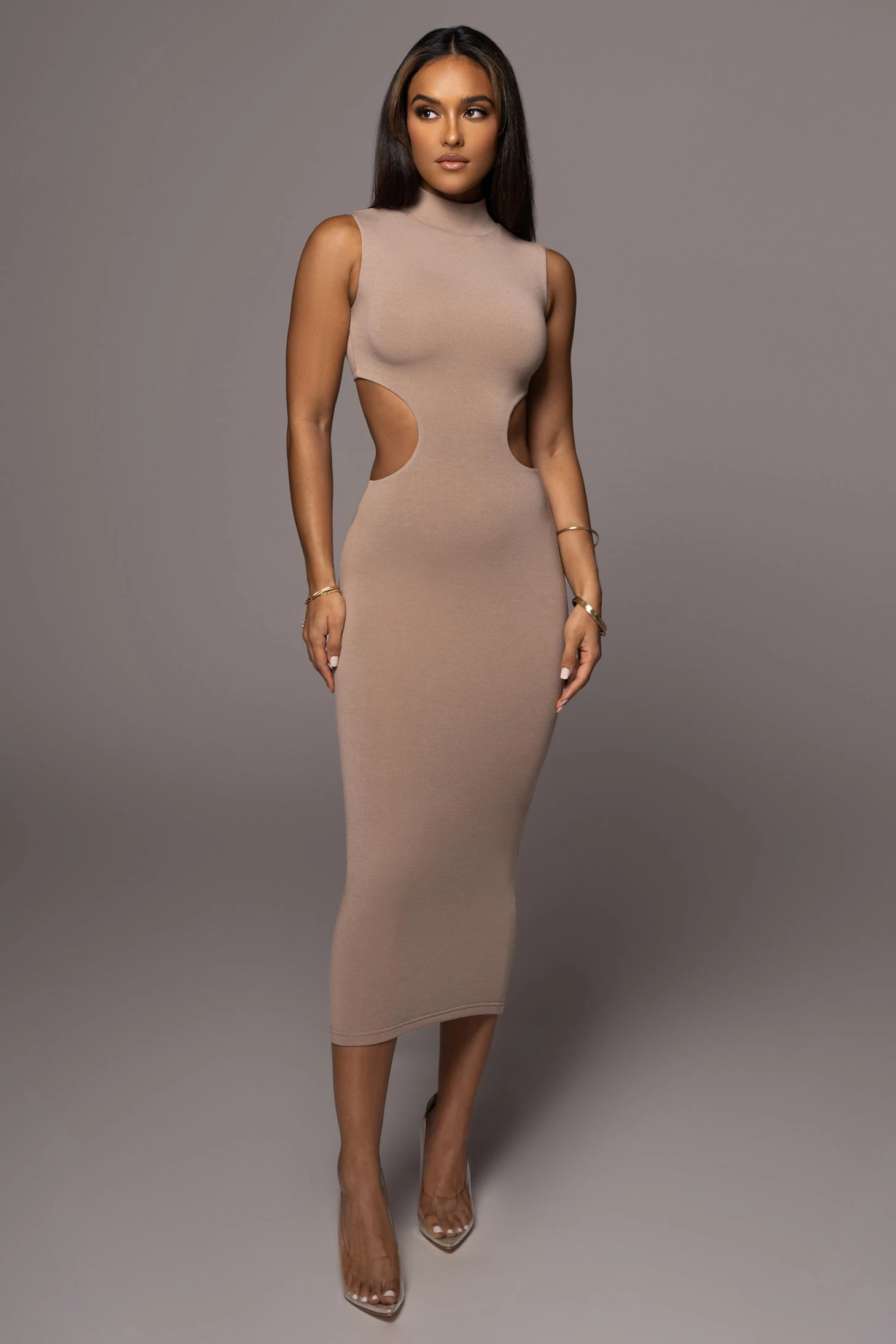 Forever mesmerizing in our Beige Til Sunrise Midi Dress. This beautiful midi dress highlights a mock neckline with sleeveless shoulders and aย sensual cutout at the waist. Double lined. Stretchy.