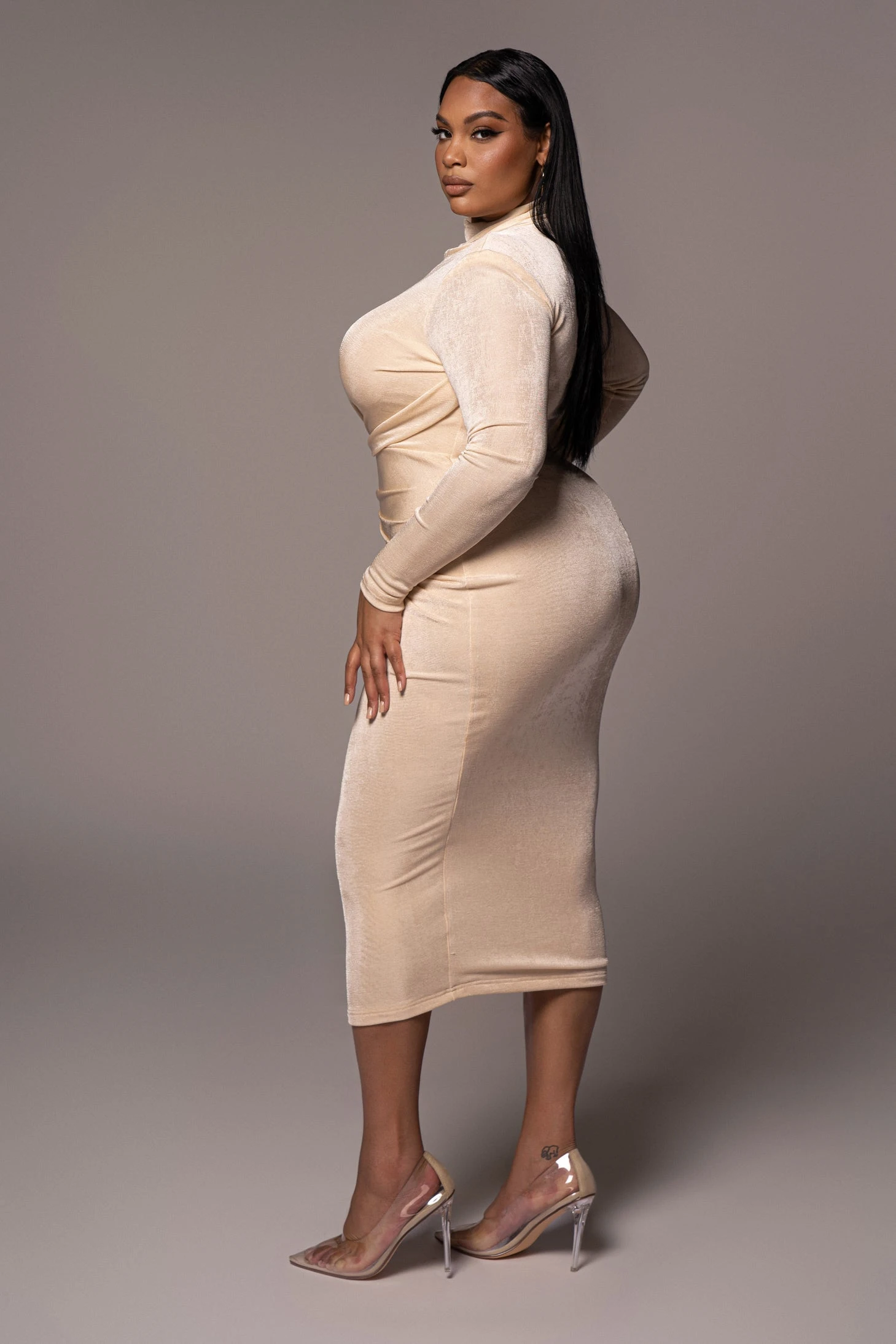 EXCLUSIVELY DESIGNED BY US FOR YOU. Steal the show in our BUTTERCREAM KARA MOCK NECK DRESS! Curated in our signature slinky fabric, this luxurious midi dress features a high neckline with long sleeves, shoulder padding, and gorgeous gathering detail at the waist for a stylish touch. Pair with our