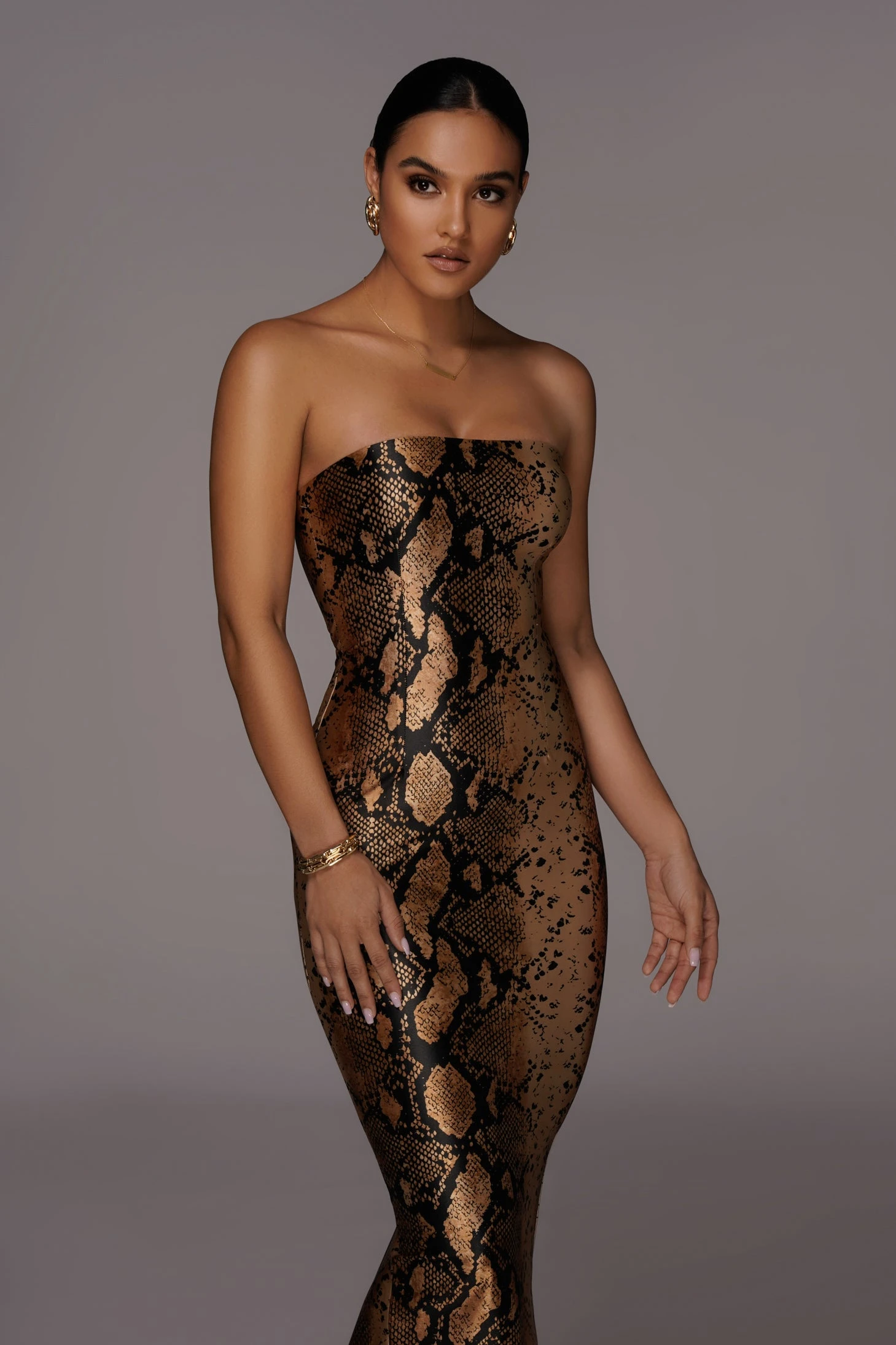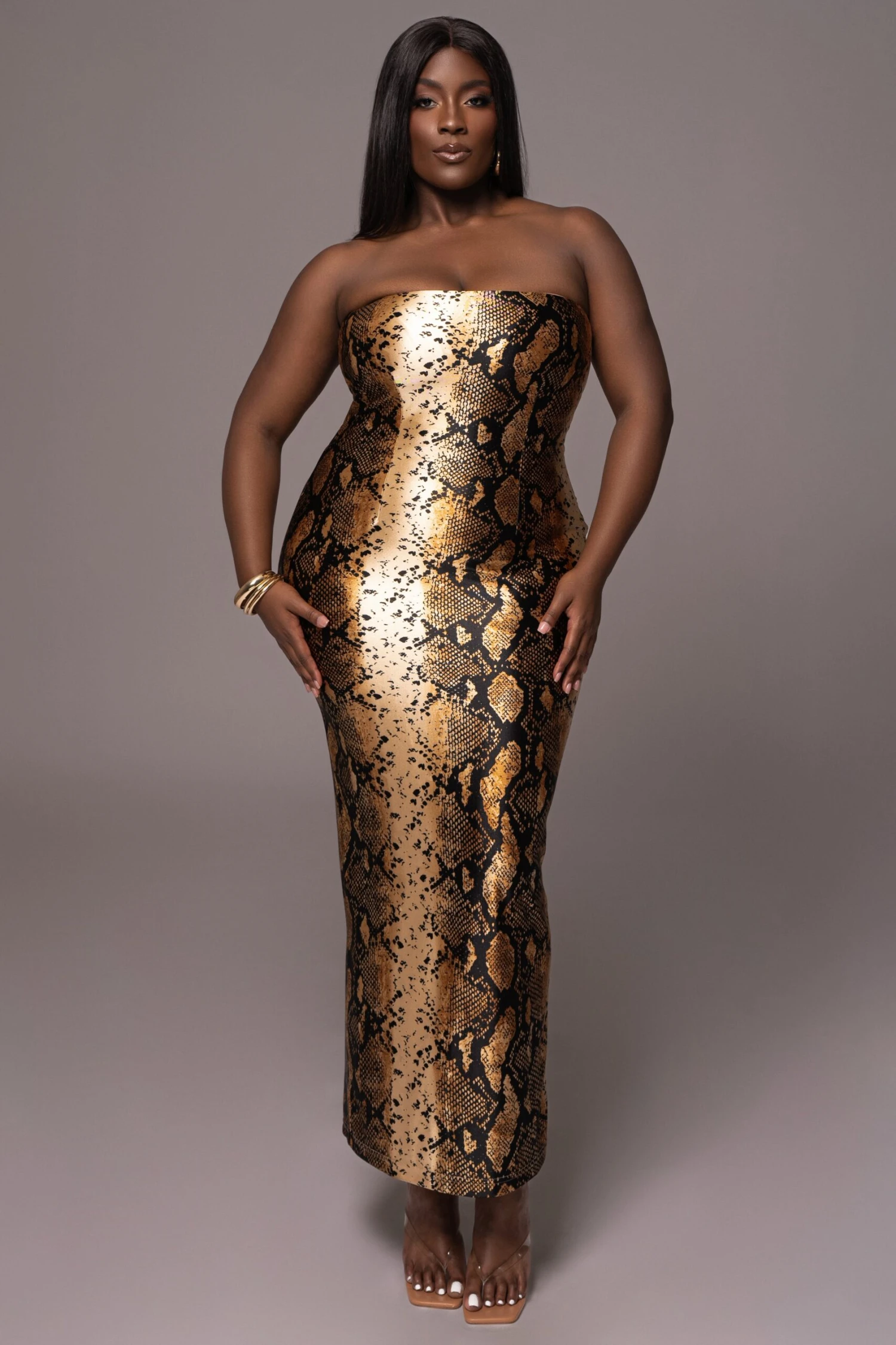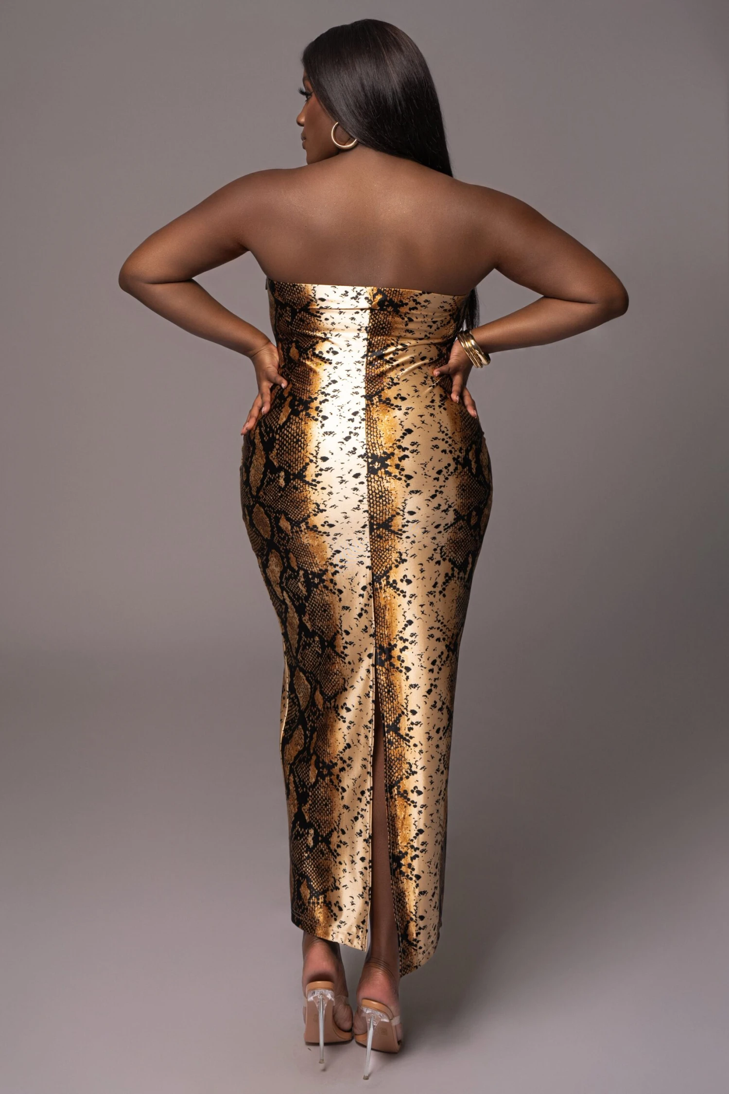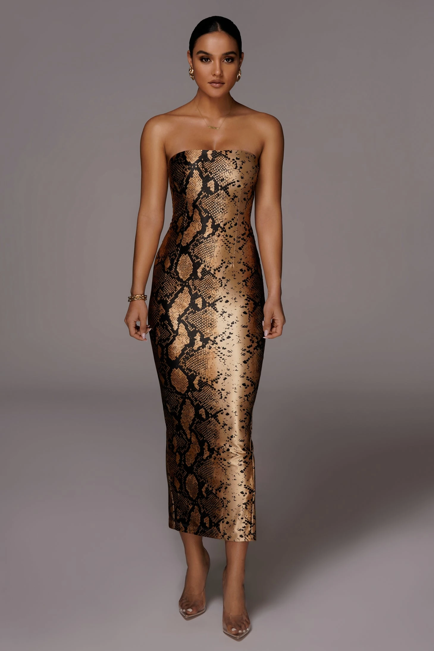 If you like the wild things in life, then the Gold Bianca Snakeskin Slit Dress is for you.ย This high shine midi dress radiates elegance in a sleek snake print with a strapless neckline andย back slit hem. Crafted with a stretchy spandex fabricย in a body-hugging silhouette. Complete withย sideย zipper for closure.ย
