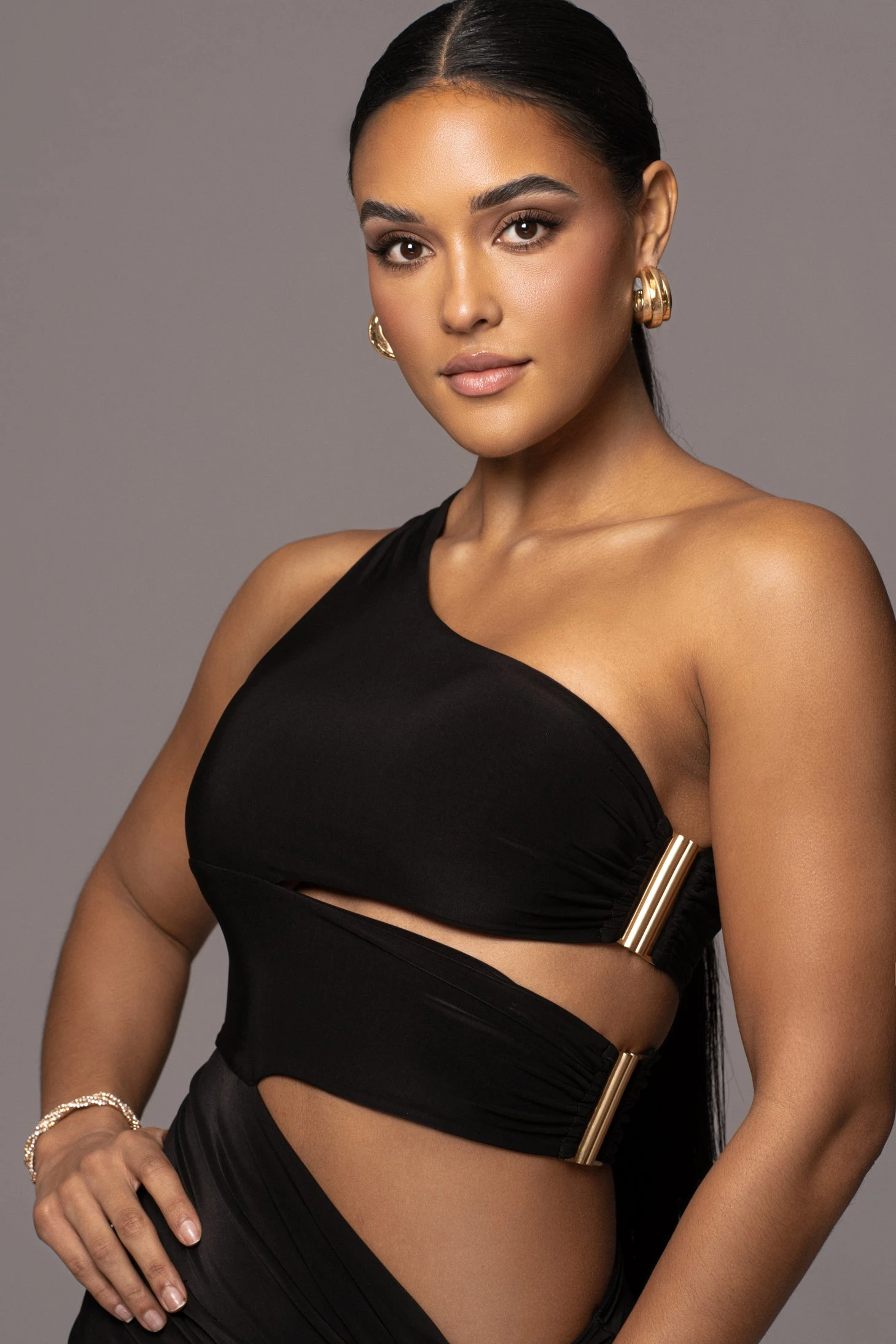 Channel your inner goddess dressed in ourย Noirย One Night Only Dress! This jaw-dropping midi dress showcases a one-shoulder neckline designed with stylish cutouts at the waist detailed with matte gold-tone clasp closures. A knotted detail with a daring thigh slit at the hip finishes the look. Stretchy. Double-lined.